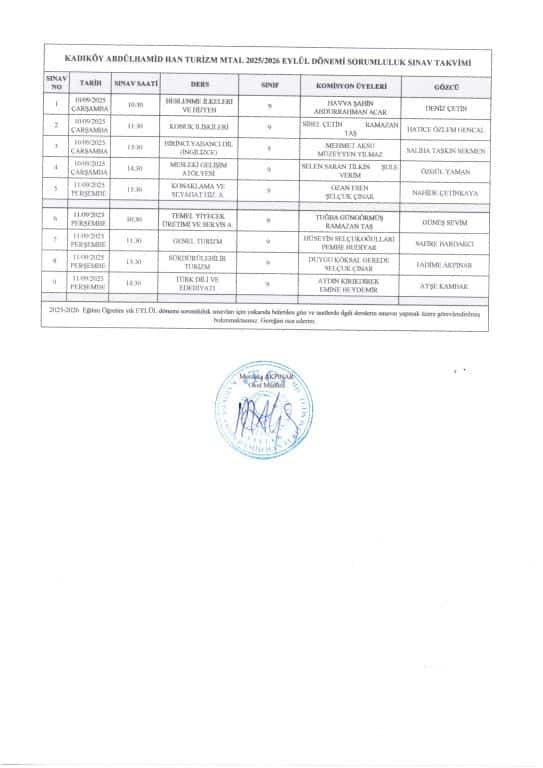Eylül Ayı Sorumluluk Sınav Takvimi